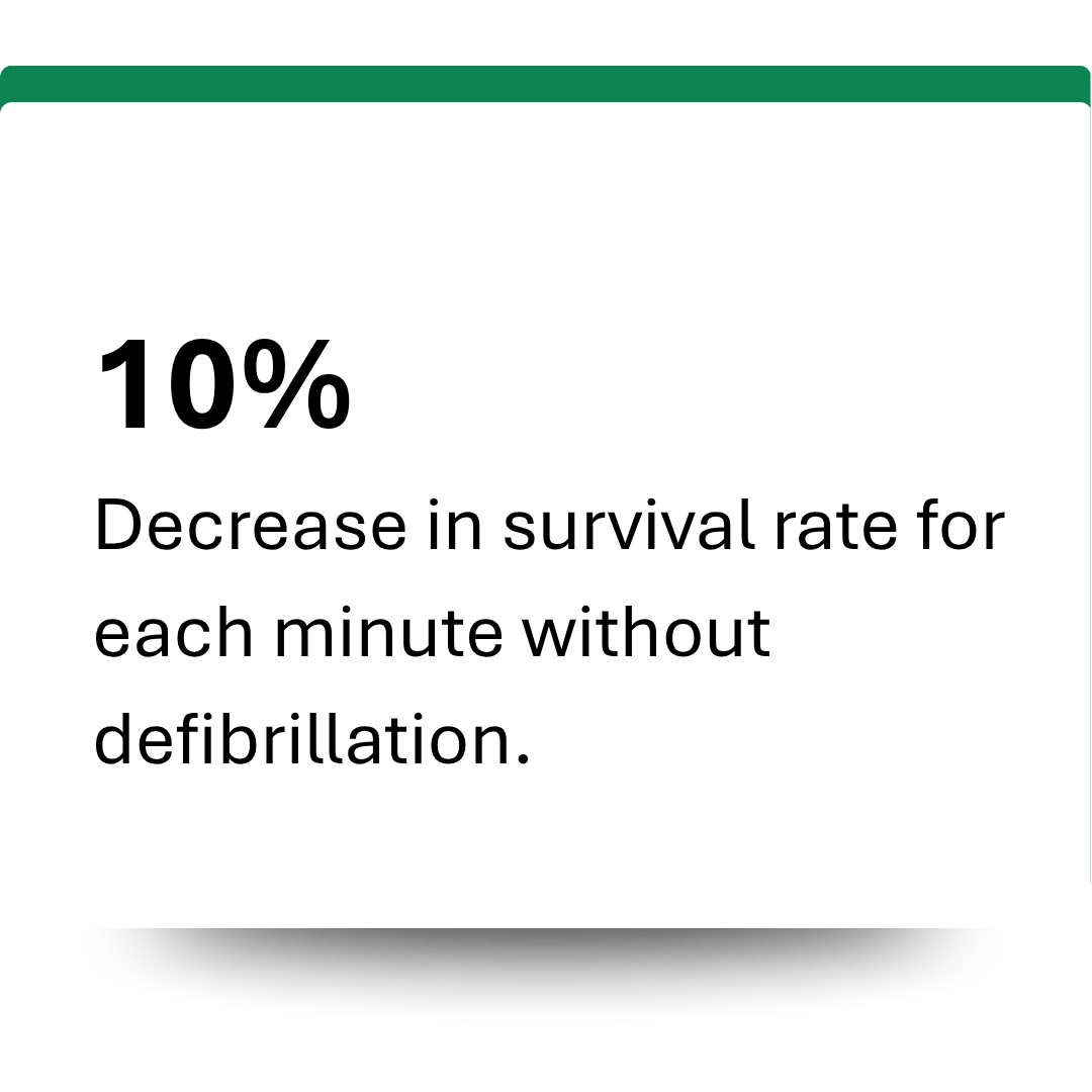 Having a defibrillator means you can step in with the tools to save a life before paramedics arrive. A defibrillator used within the first few minutes can increase survival rates up to 70%.