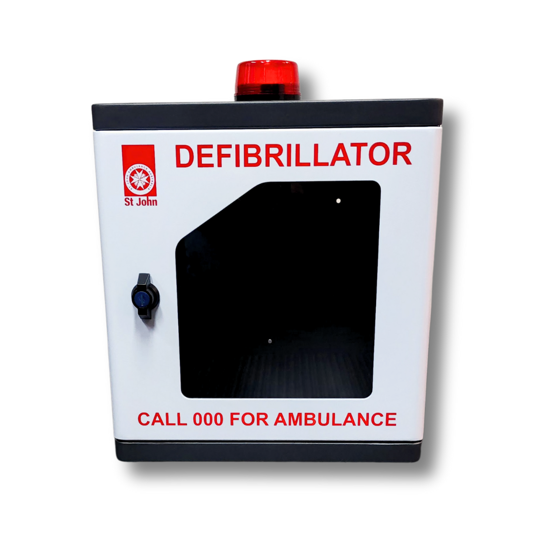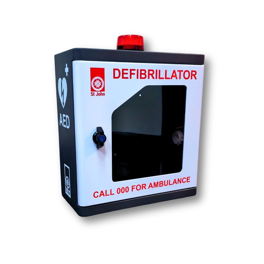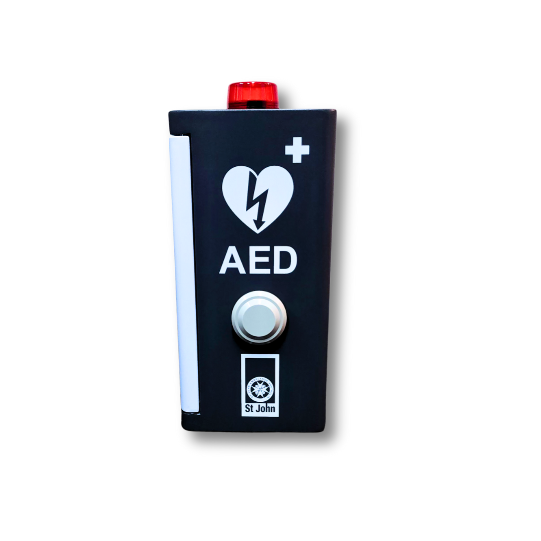 This AED Outdoor Cabinet from St John features a side ventilation outlet and is designed for safe storage of your AED and related items. It boasts a lightweight, compact design, a secure locking mechanism, and an alarm and strobe light for added protection. Additionally, its IP55 rating ensures both dust and water ingress protection.