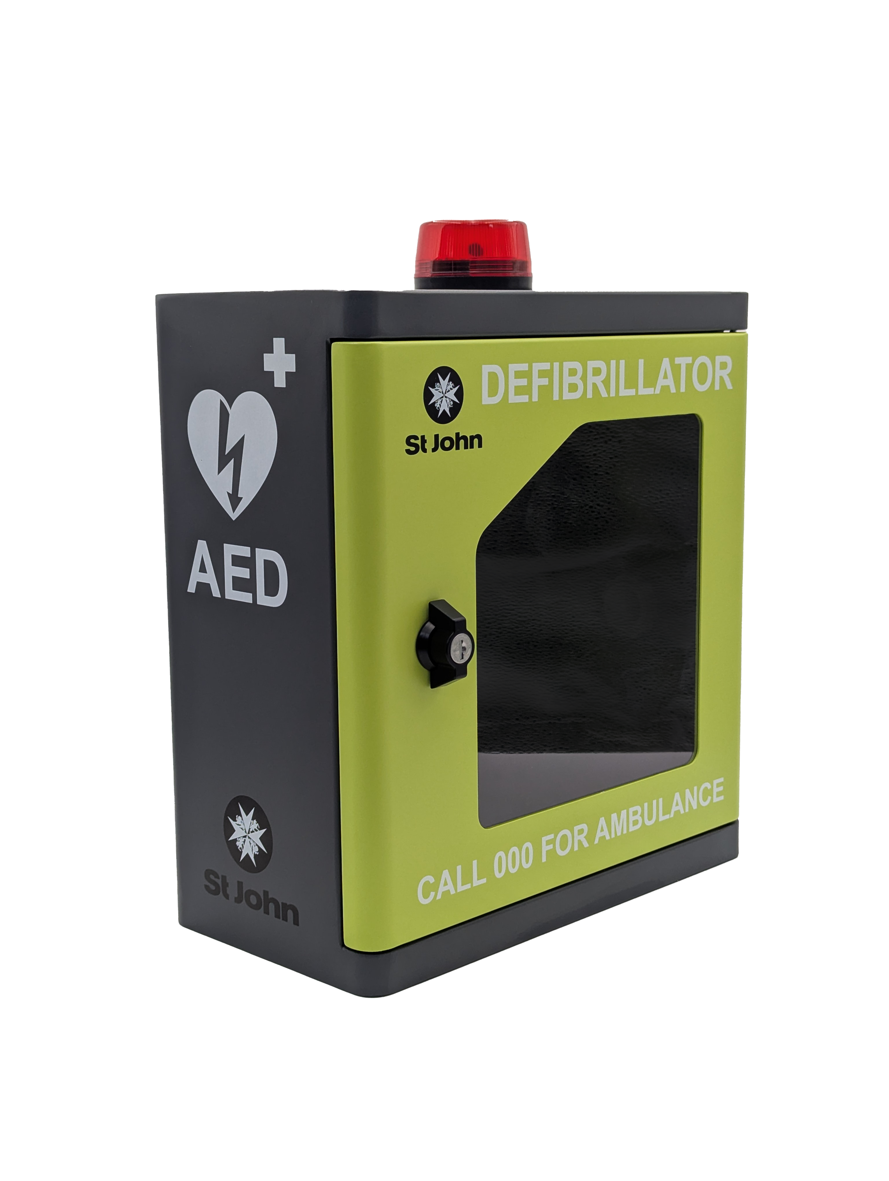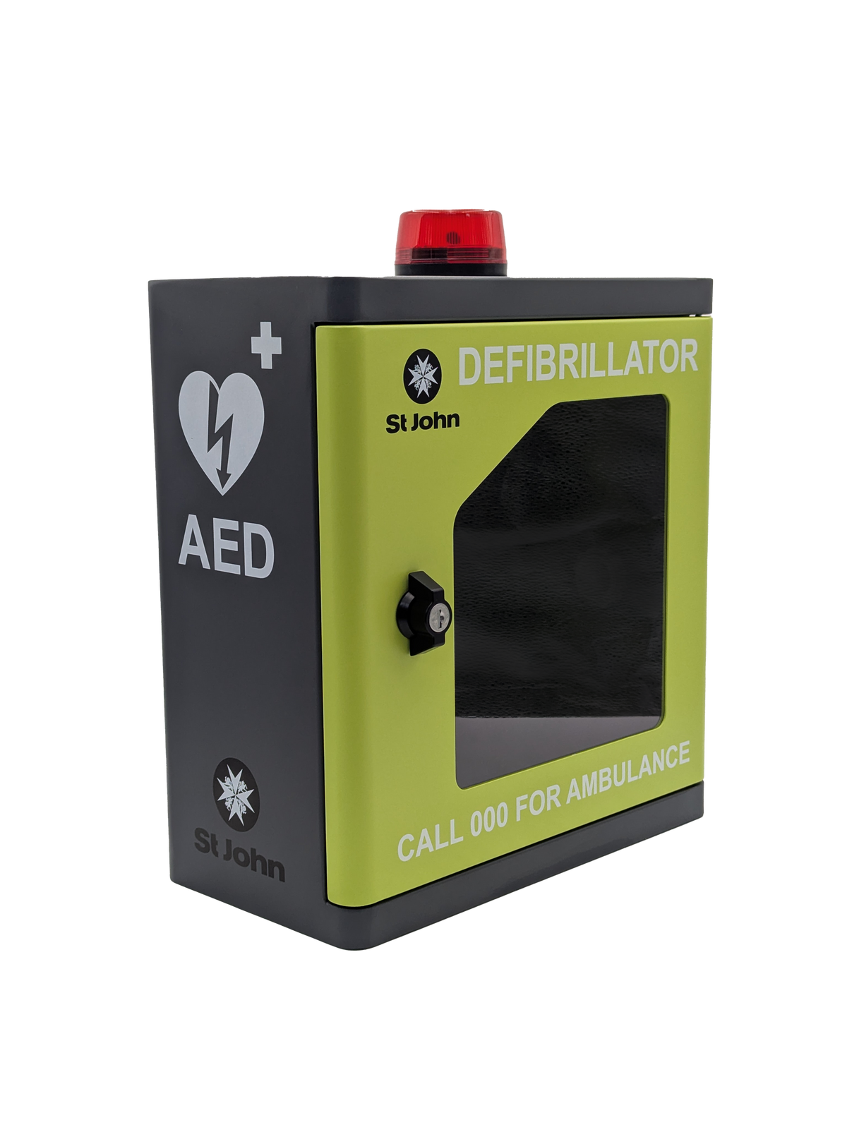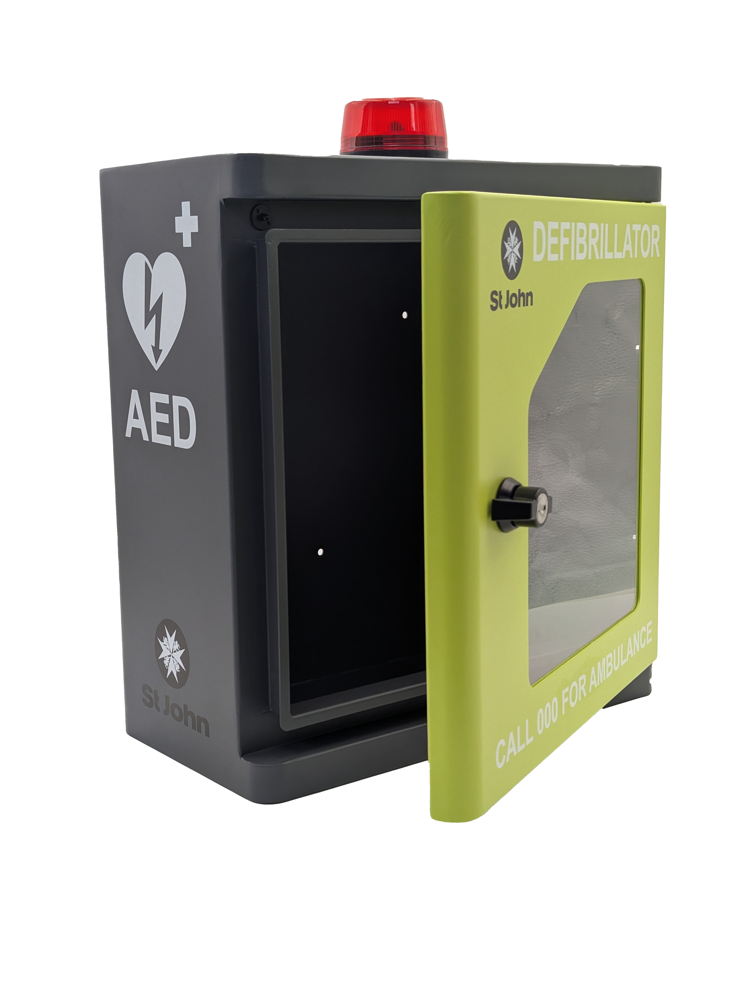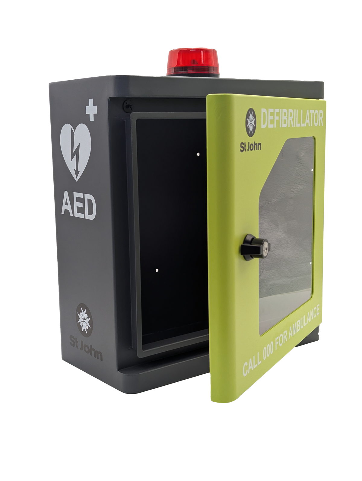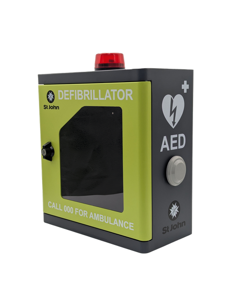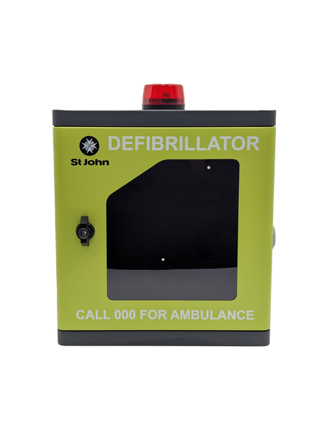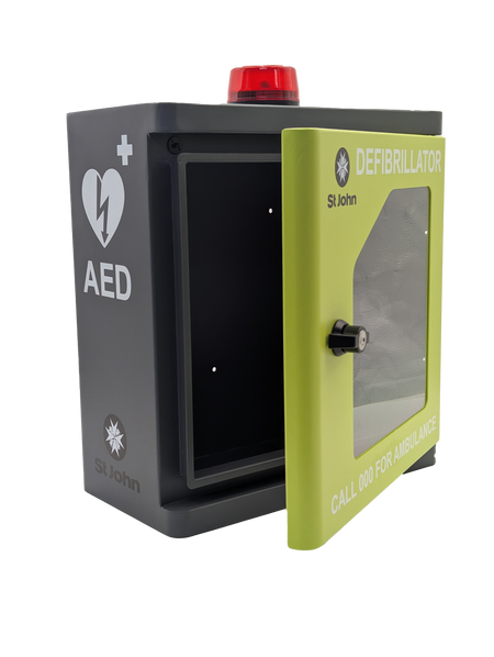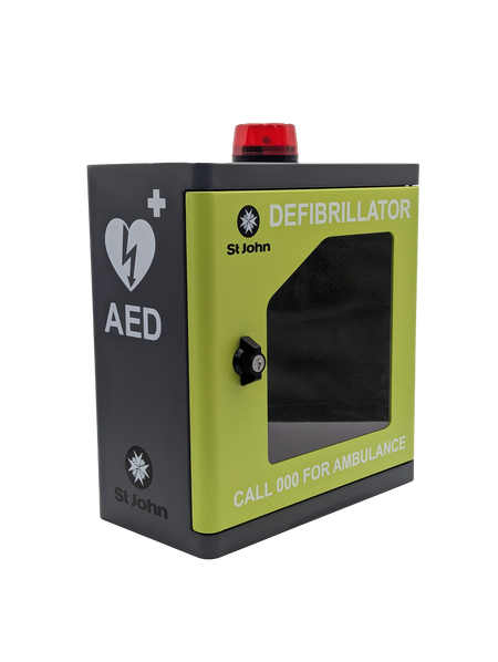 This Green AED Outdoor Cabinet from St John features a side ventilation outlet and is designed for safe storage of your AED and related items. It boasts a lightweight, compact design, a secure locking mechanism, and an alarm and strobe light for added protection. Additionally, its IP55 rating ensures both dust and water ingress protection.