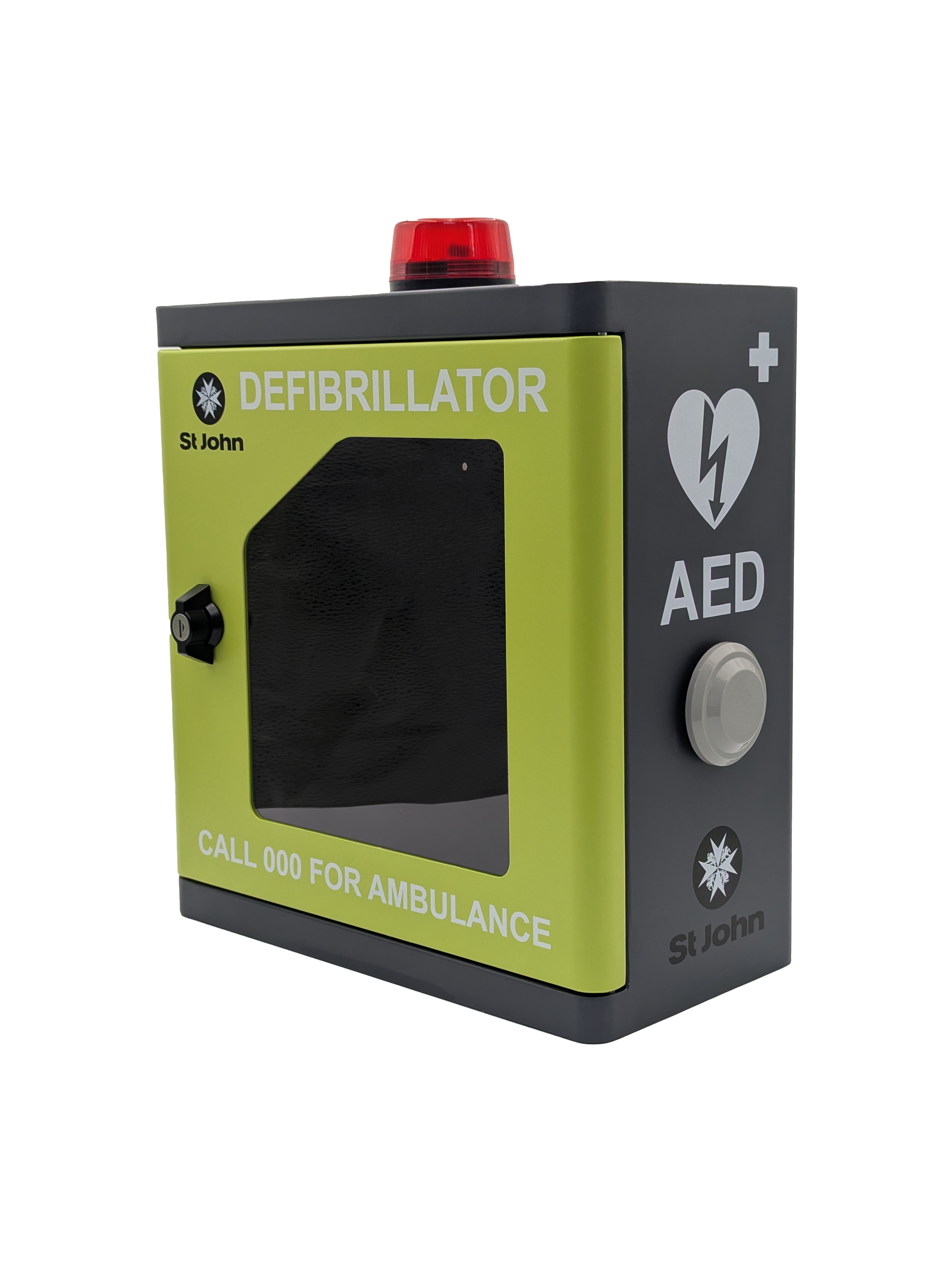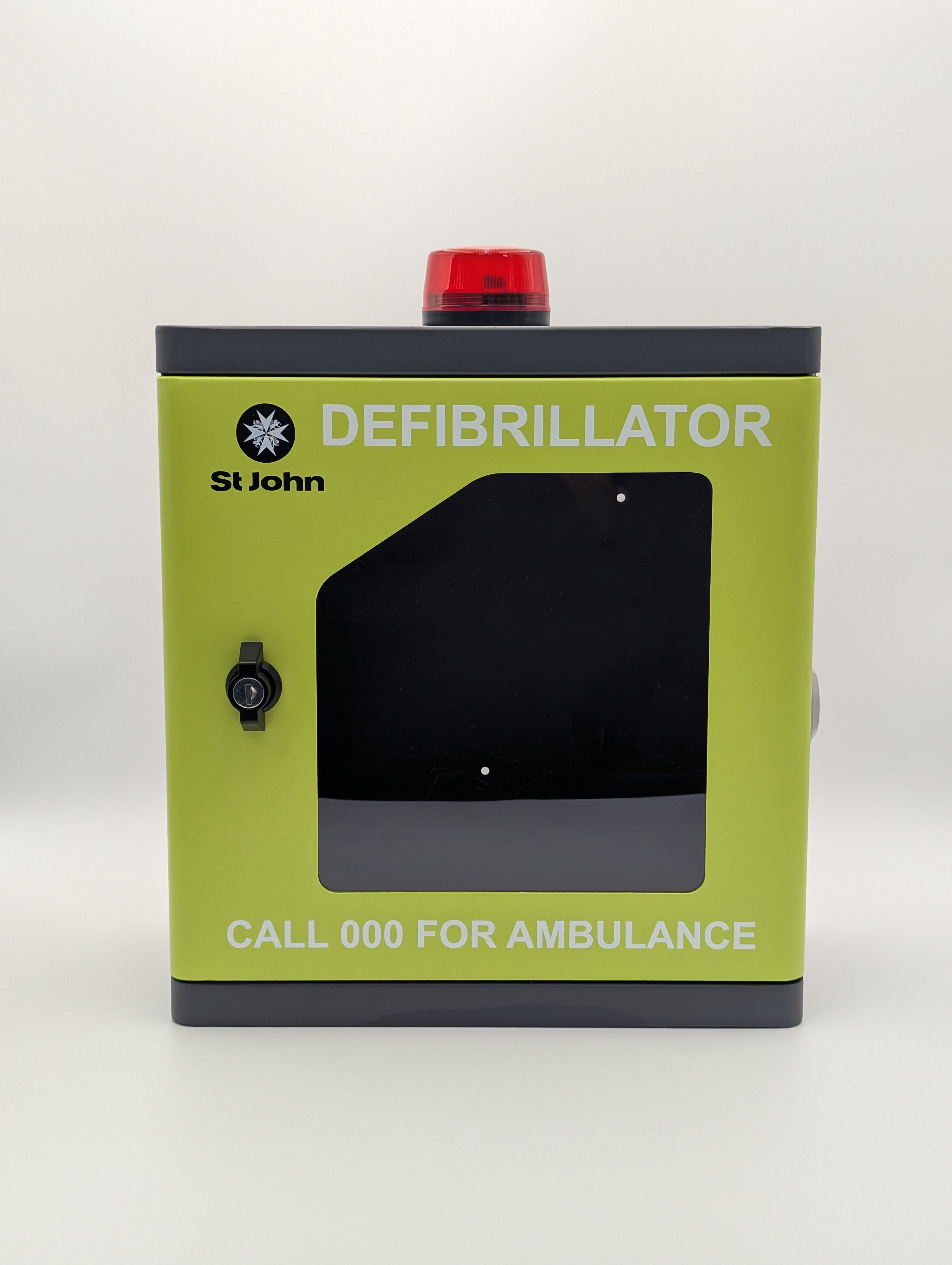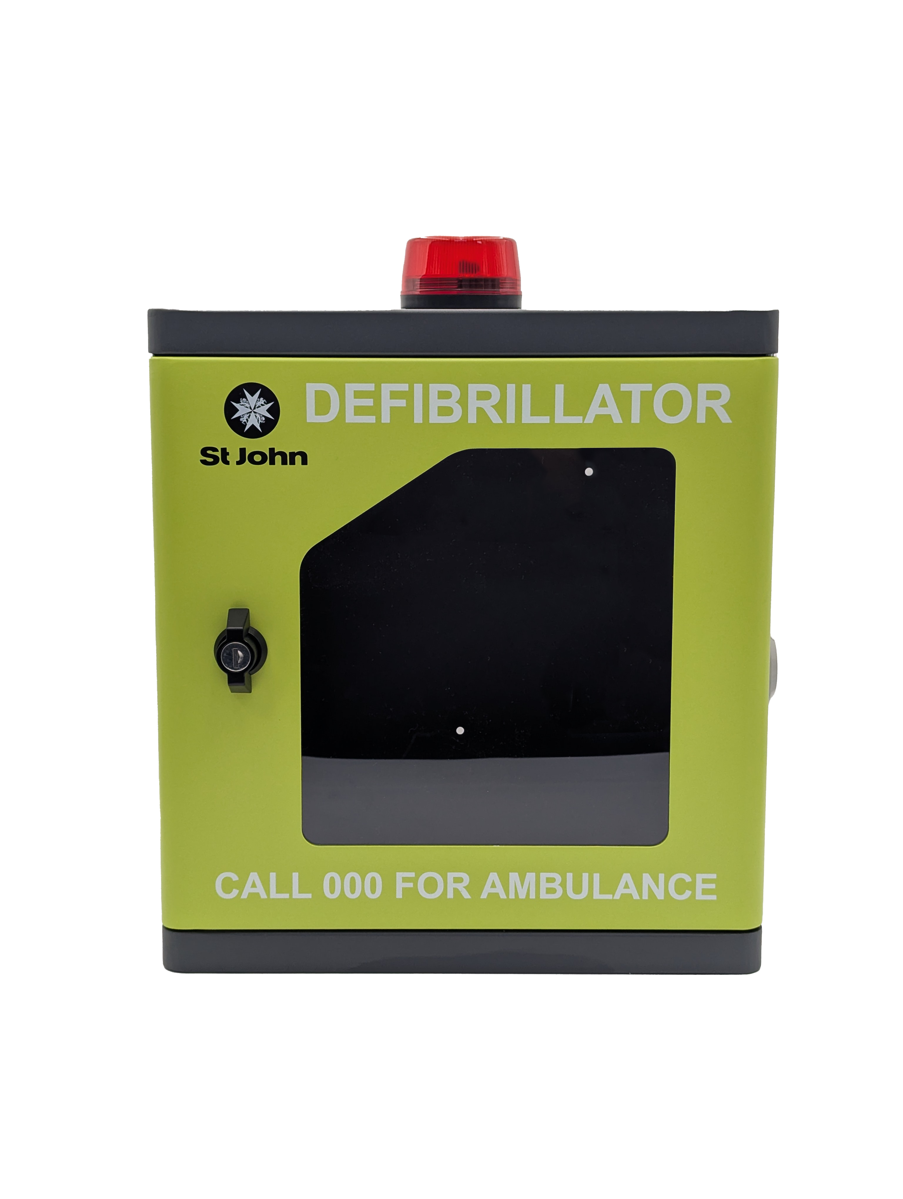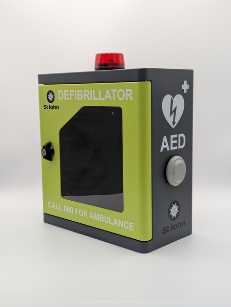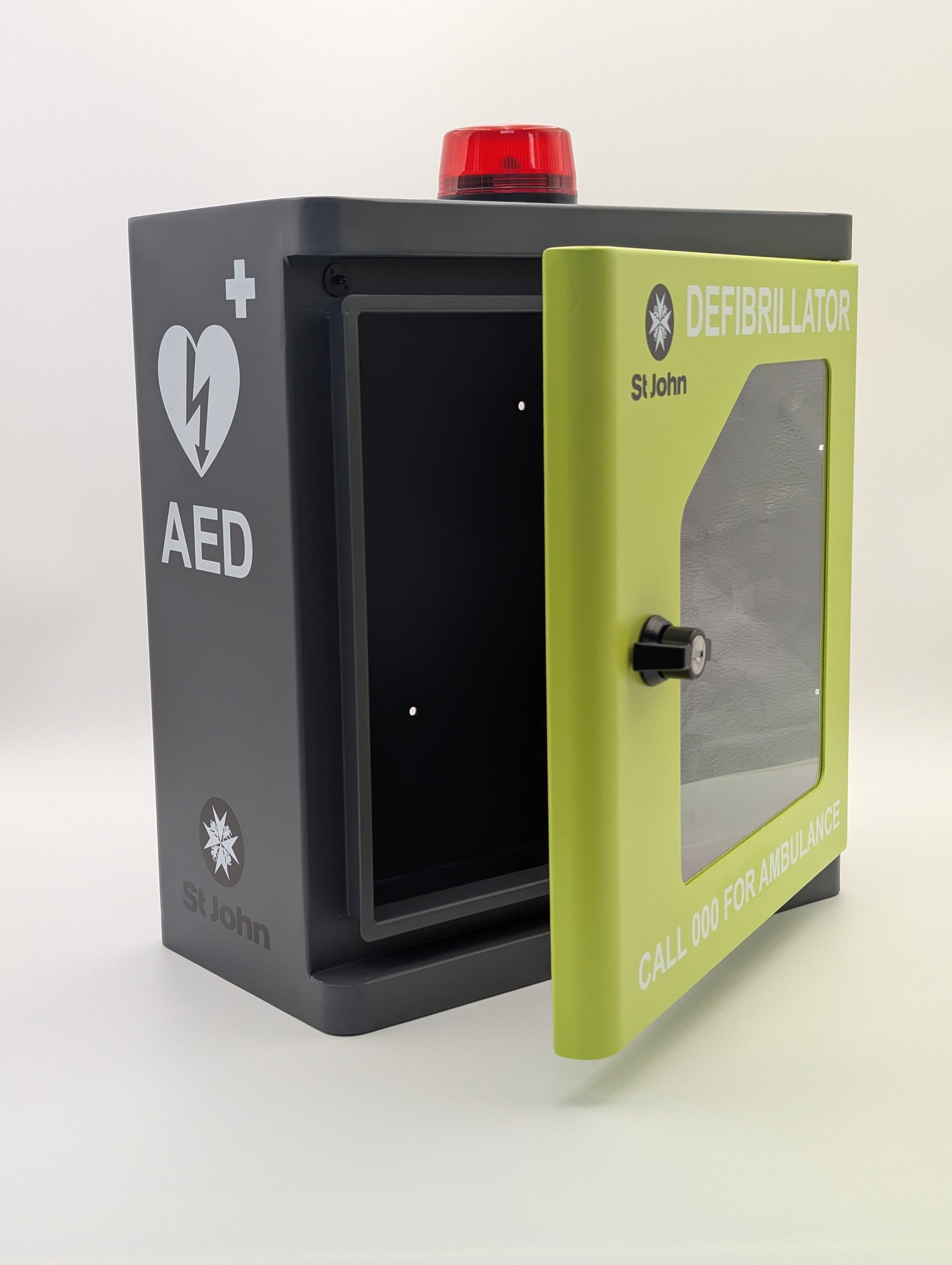 This Green AED Outdoor Cabinet from St John features a side ventilation outlet and is designed for safe storage of your AED and related items. It boasts a lightweight, compact design, a secure locking mechanism, and an alarm and strobe light for added protection. Additionally, its IP55 rating ensures both dust and water ingress protection.