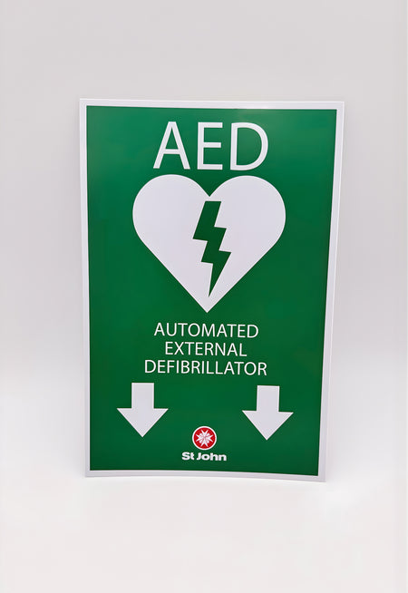 Highly visible AED sign (Poly) with down arrows to show location of defibrillator.