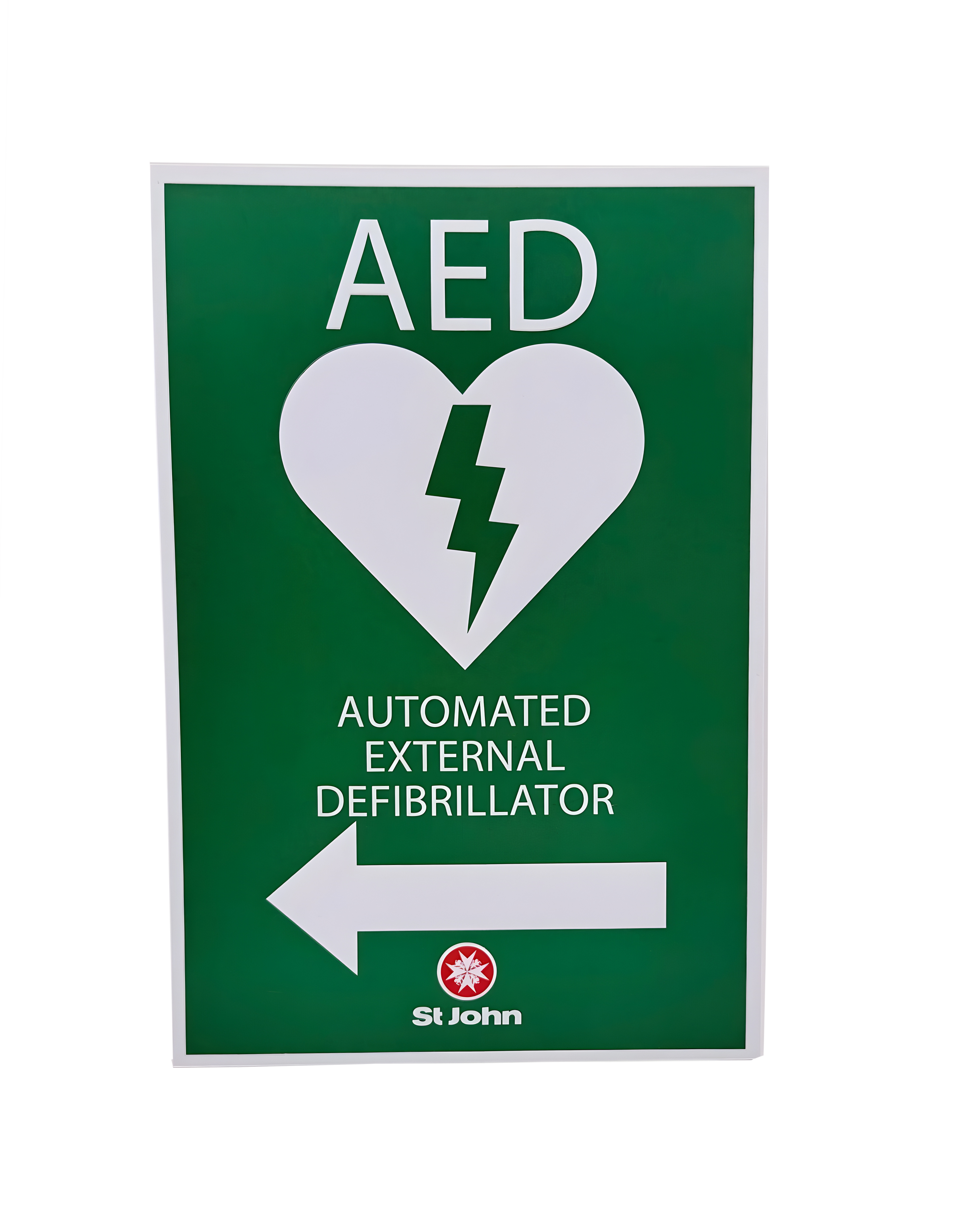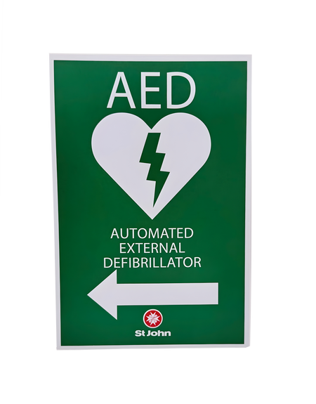 Highly visible AED sign (Poly) with left arrow to show location of defibrillator.