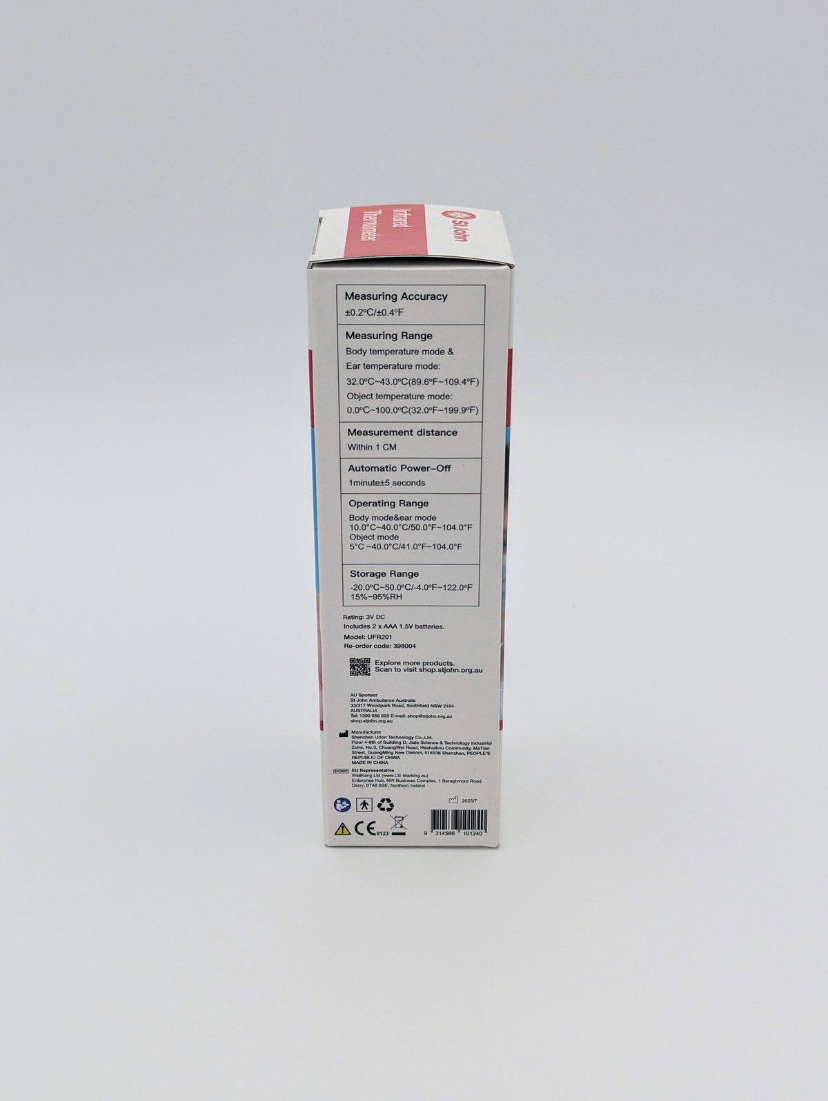 Experience precision and convenience with the St John Infrared Thermometer—your reliable solution for fast, non-contact temperature measurement. Designed for both personal and professional use, this advanced thermometer delivers accurate readings in just 1 second, helping you monitor health and safety with ease.