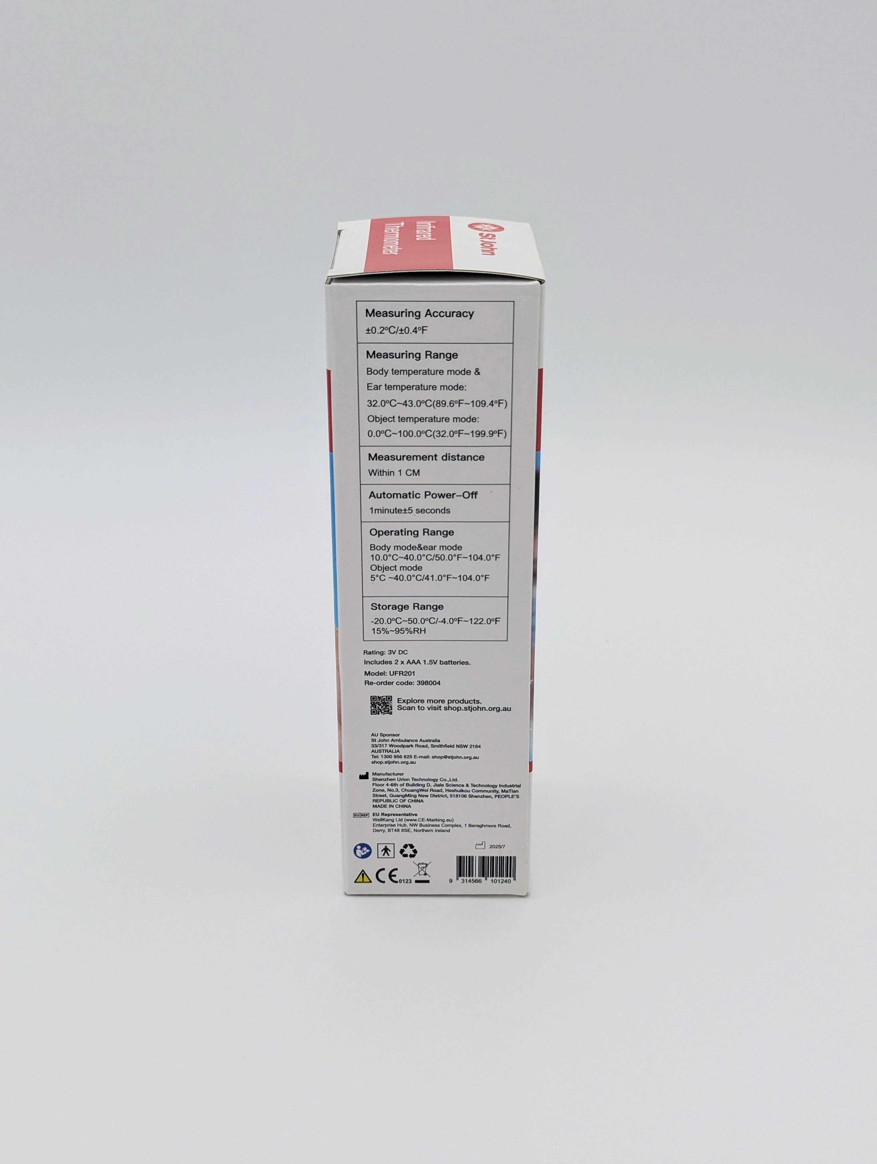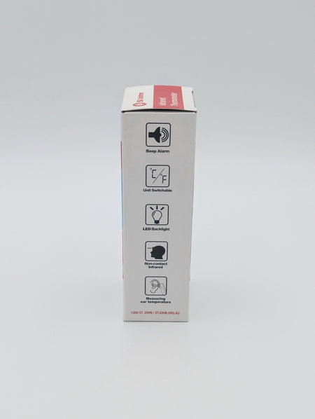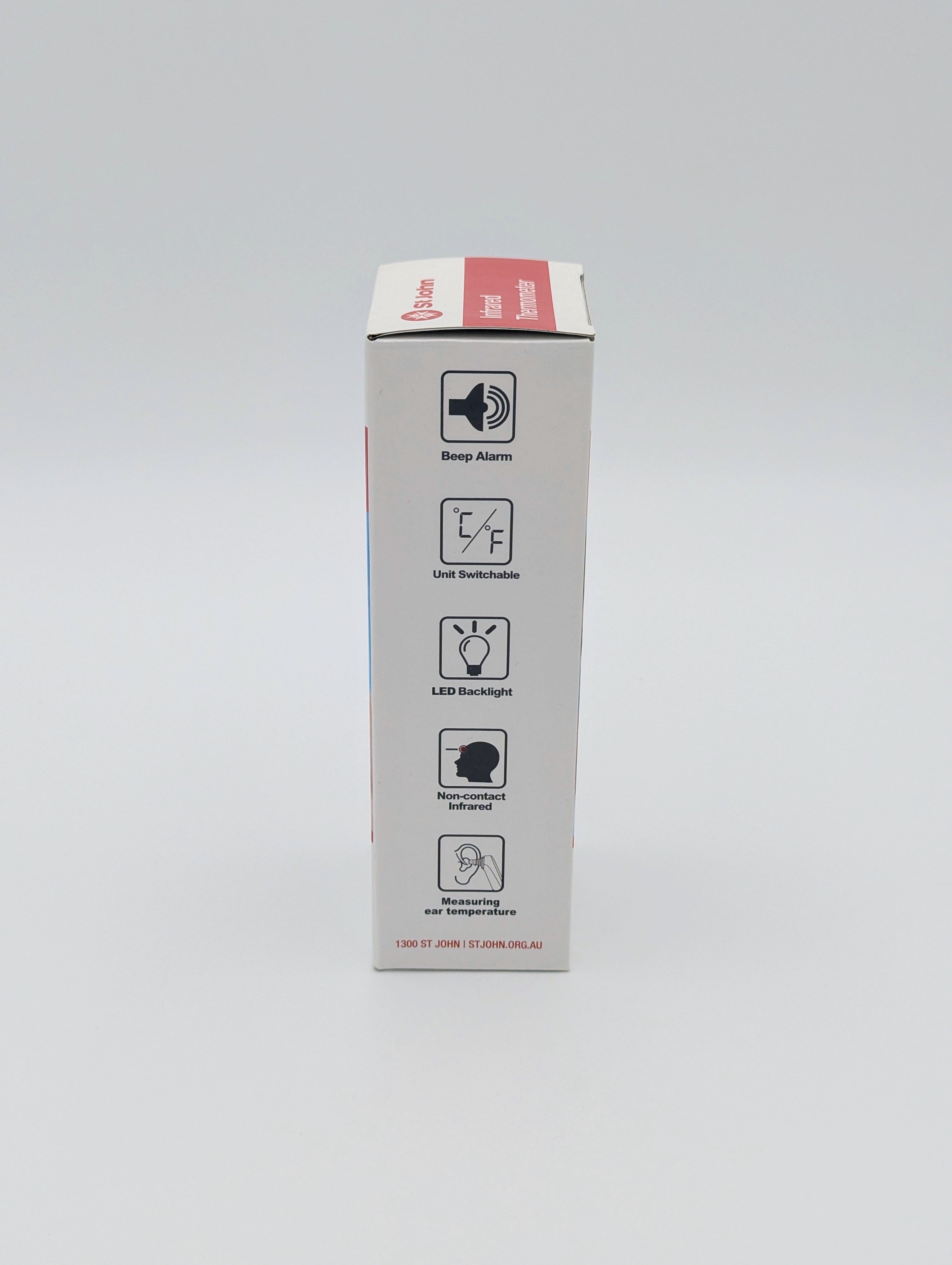 Whether you're checking body, ear, or object temperatures, the St John Infrared Thermometer adapts to your needs with switchable °C/°F units, dual mode functionality, and a beep alarm for quick alerts. Its LED backlight ensures visibility in any lighting condition, while the 20-memory storage feature allows you to track temperature trends over time. Plus, it's TGA approved, ensuring it meets Australian regulatory standards for medical devices.