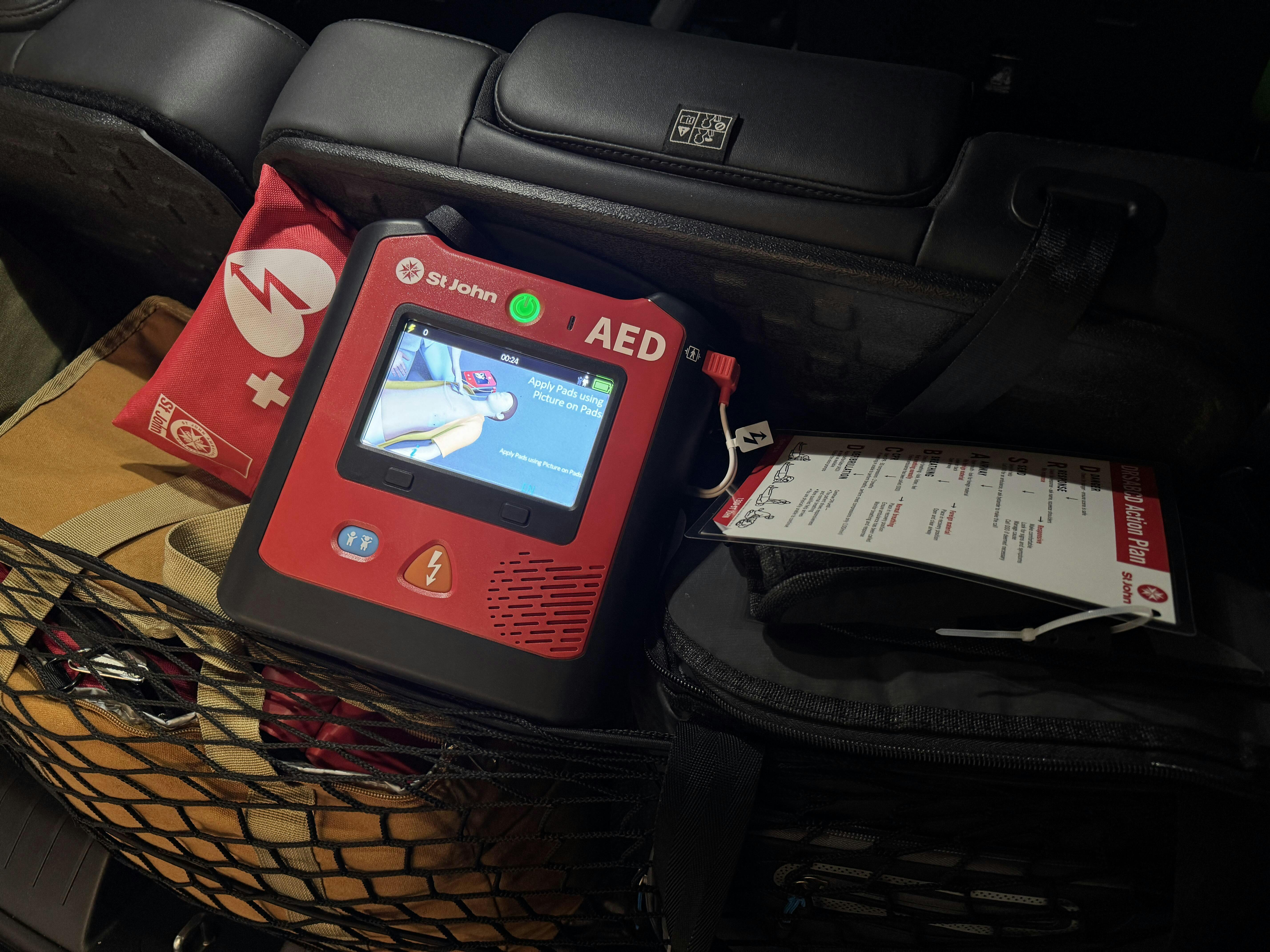 - St John AED Ready Kit including gloves, razor, shears, gauze swabs, resuscitation mask, and alcohol wipes.
